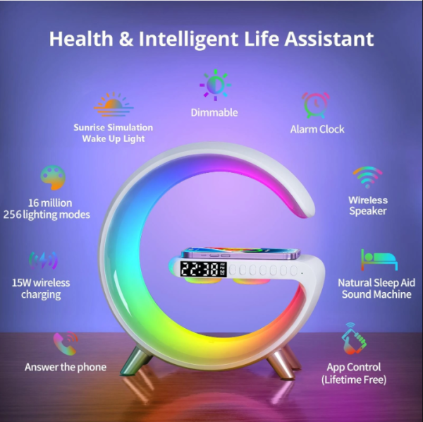 G63 Multifunkciós szórakoztató állomás – Bluetooth hangszóró, vezeték nélküli töltő, RGB LED party fény és éjszakai lámpa – 10W (BBV)
