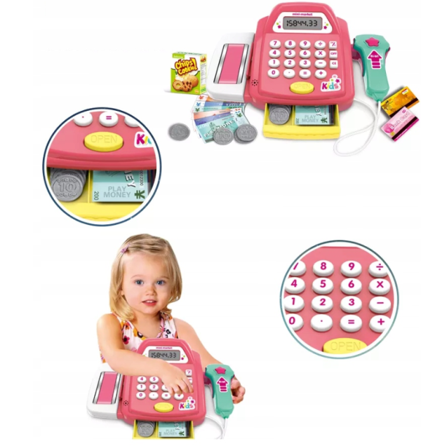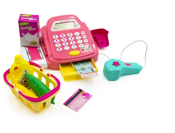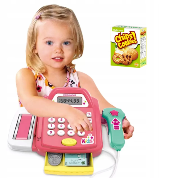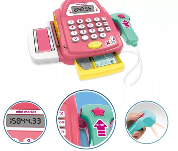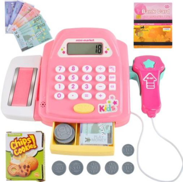 Interaktív gyermek játék pénztárgép – játék pénzzel, élelmiszerekkel és kasszaszalaggal (BBJ)