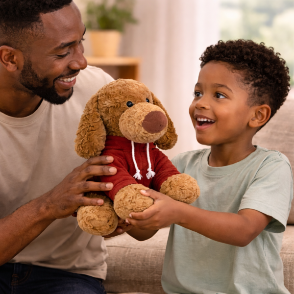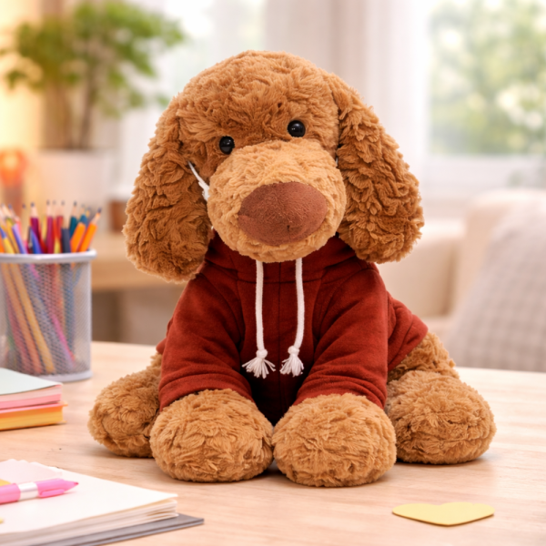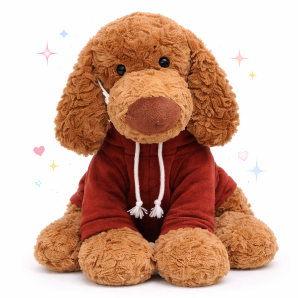 A Loock Series plüss kutyus egy imádnivaló, piros pulcsis kis társ, aki tökéletes választás ölelgetéshez, pihenéshez vagy akár dekorációként is.