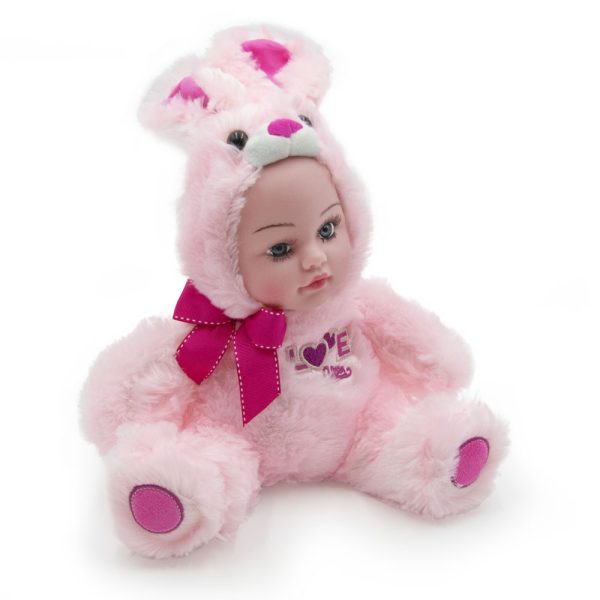 Síró, nevető, beszélő baba óriás szempillával – plüss anyagú nyuszis jelmezben (BBJ)